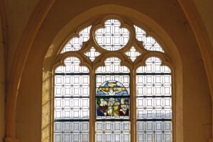 Réalisation de vitreries ornementales peintes en grisaille et jaune d’argent, création de vitraux d’accompagnement, réalisation de vitreries losangées…