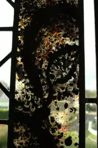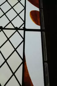 Les larges filets sont peints en différents tons de jaune d’argent. Ils se découpent sur le tapis losangé ocre-rose. Les nouveaux vitraux accompagnent le décor intérieur de l’église entièrement restaurée.