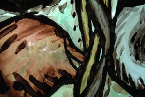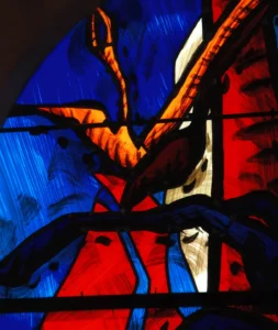Ce vitrail marque un accueil généreux adressé aux visiteurs et pratiquants. Il est placé sous la symbolique des forces de Vie que sont les quatre éléments : l’Eau, la Terre, le Feu et l’Air. On entre dans la représentation d’une végétation originelle.