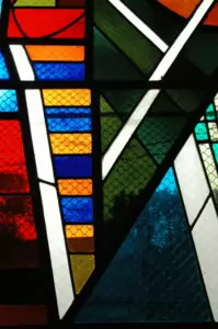 Les cabochons en dalle de verre grossièrement taillée qui ponctuent les parties ornementales, marquent la particularité de ces vitraux remarquables.