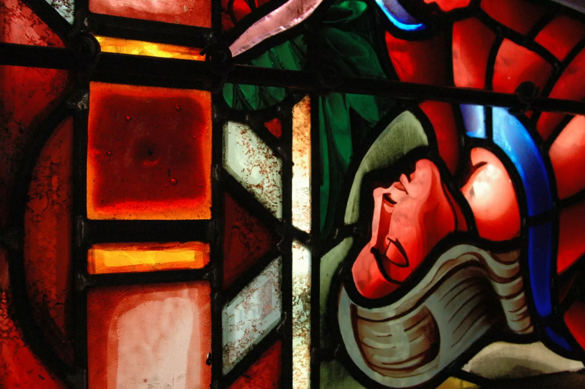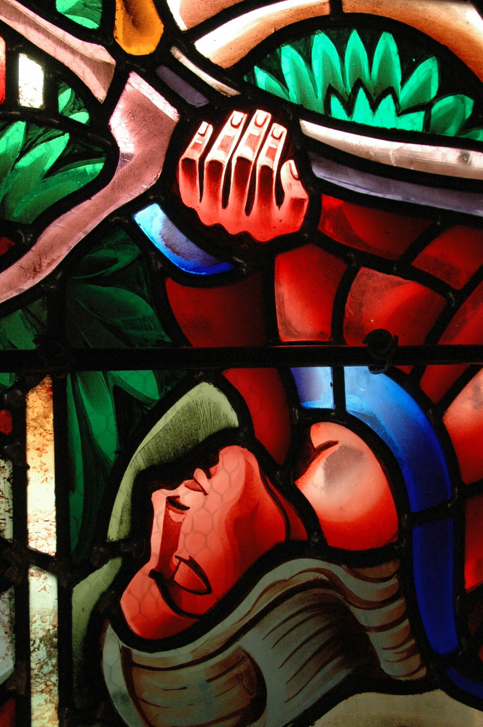 Les cabochons en dalle de verre grossièrement taillée qui ponctuent les parties ornementales, marquent la particularité de ces vitraux remarquables.
